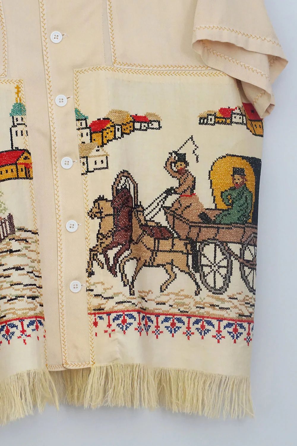 • Vintage table runner with cross stitch embroidery and fringe hem